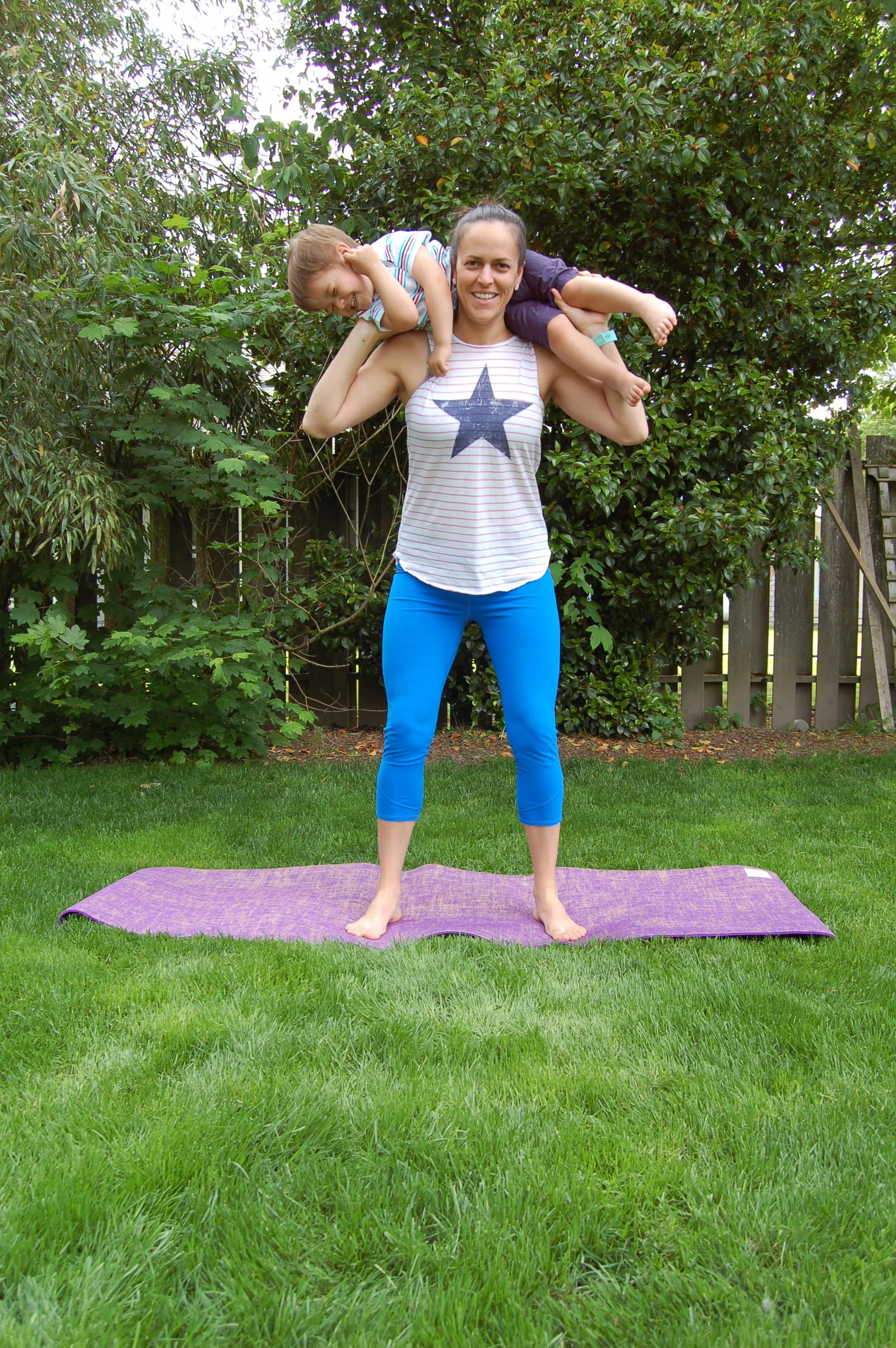 Start with feet slightly wider than hip width, with weights or a small child firmly balanced on your shoulders