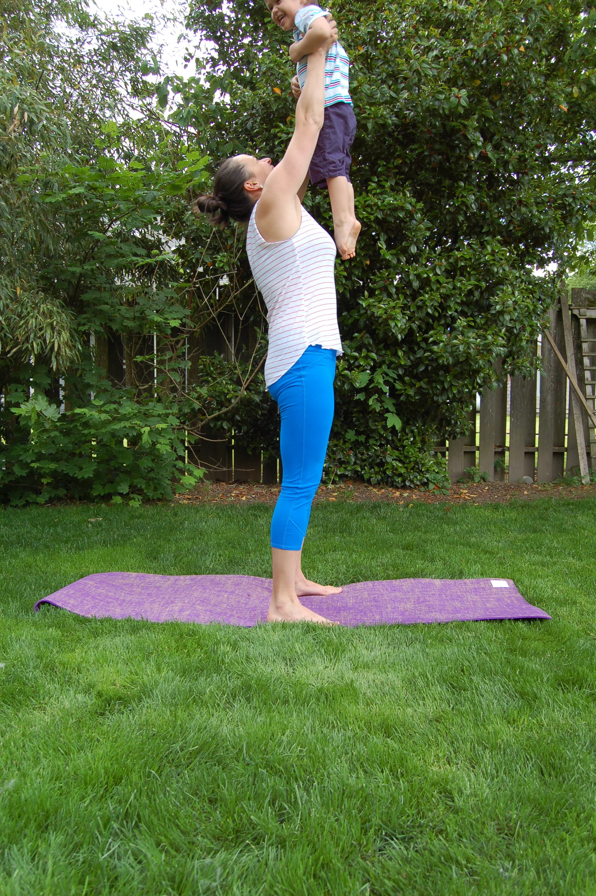 Overhead press: Start with weights/toddler at shoulder height. Dip at the knees and drive arms up
