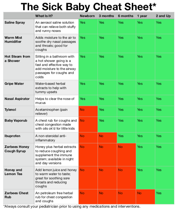I was somewhat surprised after becoming a mom with how little medication is approved for use in small kids. And these limitations go on for years! The entire drug store cold and flu aisle is dedicated to people older than about 12. So this list is actually applicable to older children as well. The cheat sheet at the bottom of this page is the product of trial and error in our house. Bookmark it, print it, and hang it in your bathroom because if you’re anything like me, you always forget one thing that could have helped your little one have a better night’s sleep when crunch time rolls around. And don’t forget to keep the things that work for you on hand, because no one ever gets sick during regular business hours!
